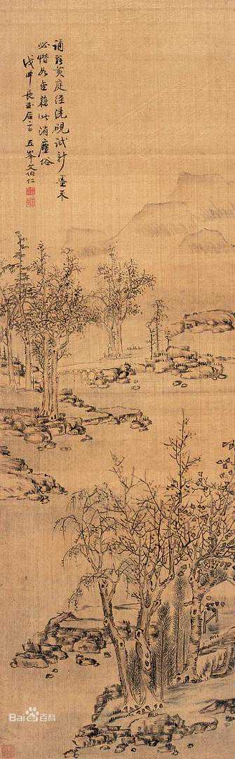 尽管命运多舛,但文伯仁的绘画才华却不容小觑。他擅长画山水,其画风深受王蒙的影响。他不仅学习“三赵”(令穰、伯驹、孟頫)的绘画技巧,还将自己的巧思融入其中。他的山水画既有简笔的抒情意趣,也有繁笔的郁茂境界。