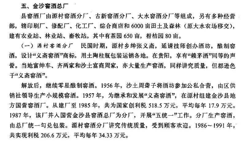 1923年,金沙县乡绅张义斋在源村自办酒坊,破例生产窖酒,并取名设计了『义斋窖酒』商标,用土陶柱瓶包装运销各地,此酒后更名为源村窖酒,继而合并成金沙窖酒。