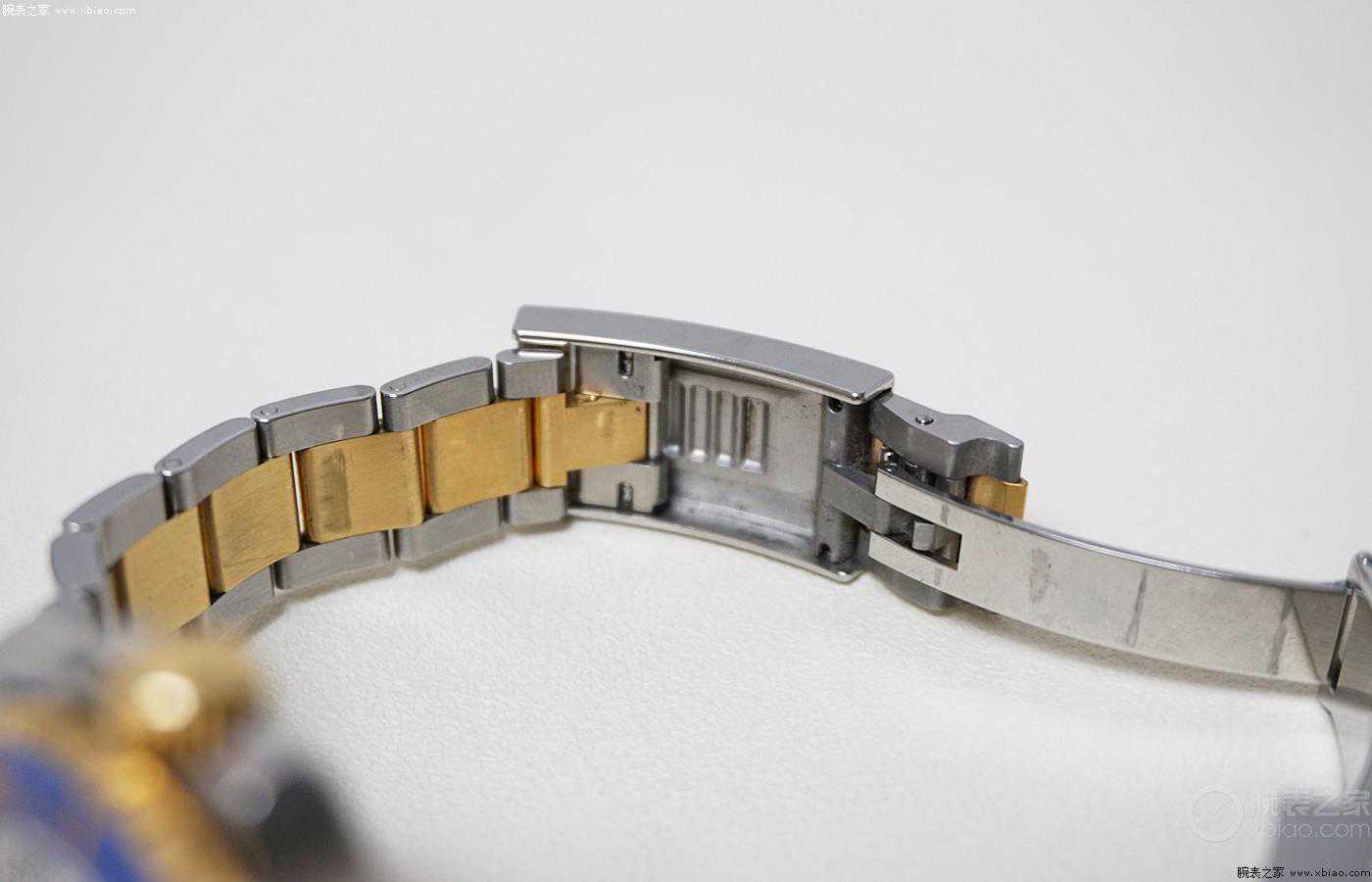 劳力士间金水鬼使用劳力士蚝式表链。黄金的中段表链,大大增加了这只手表的豪华感。间金鬼同样使用劳力士潜水表的表扣快调,可以延长或缩短表链长度。劳力士的表扣长度快调非常好用。抬起表链末端,就可以自由滑动,调长或调短。调好之后,压下表链末端,就卡住固定好了,非常方便。虽然现在很多名表品牌的运动表,都有表链快调功能,但劳力士是最好用的之一。