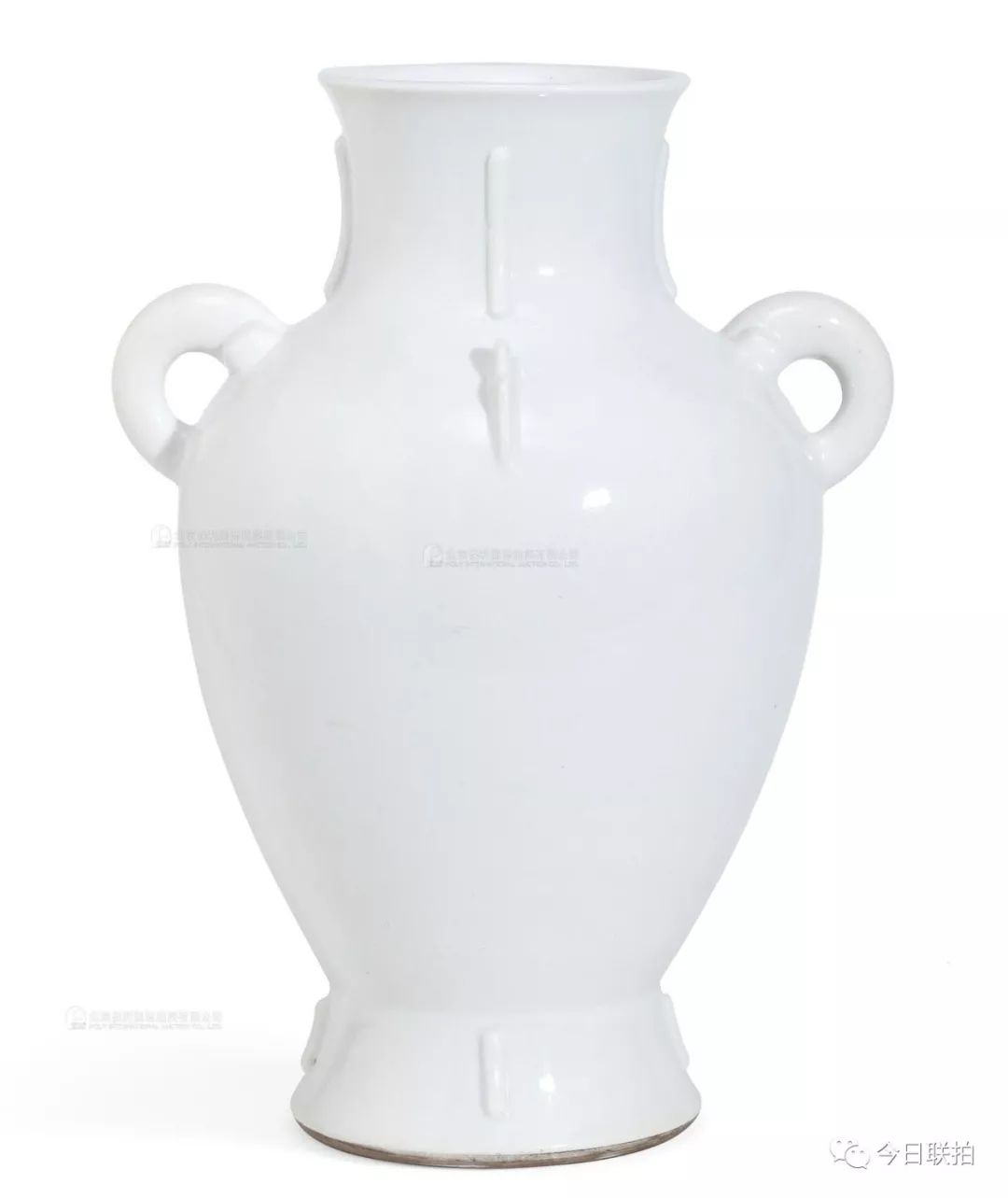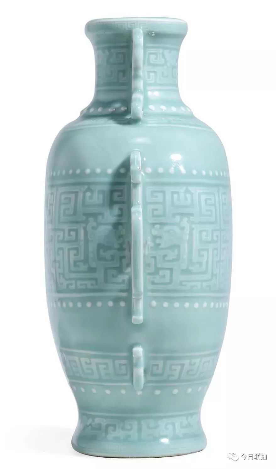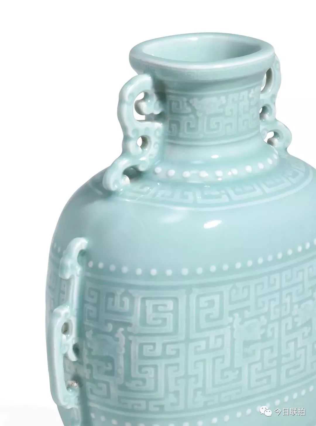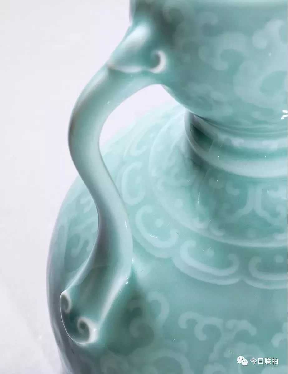 另一件清乾隆粉青釉模印夔龙纹双耳扁壶,原为FrankCaro、EvelynAnnenbergHall、北美十面灵璧山居等诸多名家的旧藏,器身自上而下共有七层纹饰,均以模印夔龙纹为主;通体施粉青釉釉面光滑凝腻,有玉之纯净盈透感。