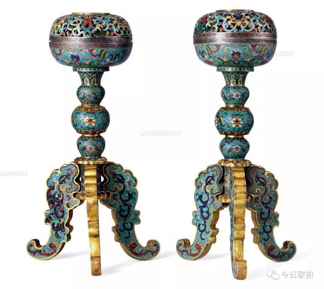 清乾隆铜胎丝珐琅夔龙纹香熏式帽架(一对)