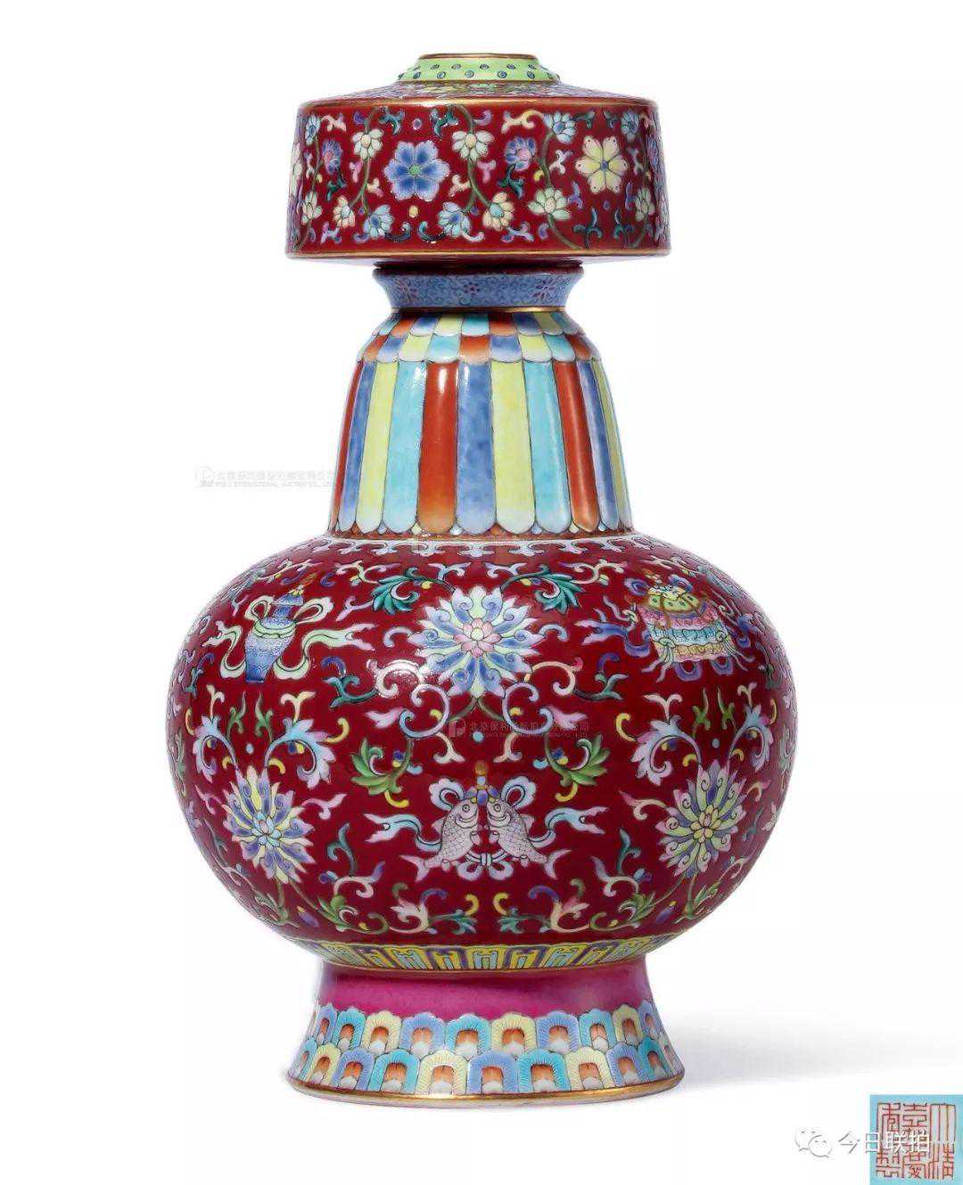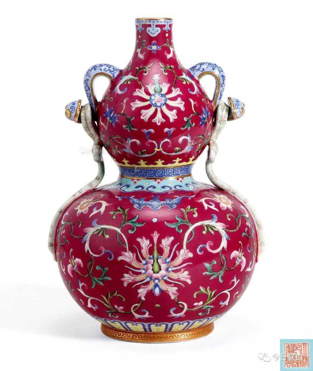 清乾隆脂红地粉彩番莲纹如意耳葫芦瓶