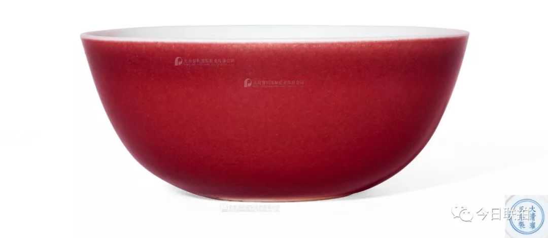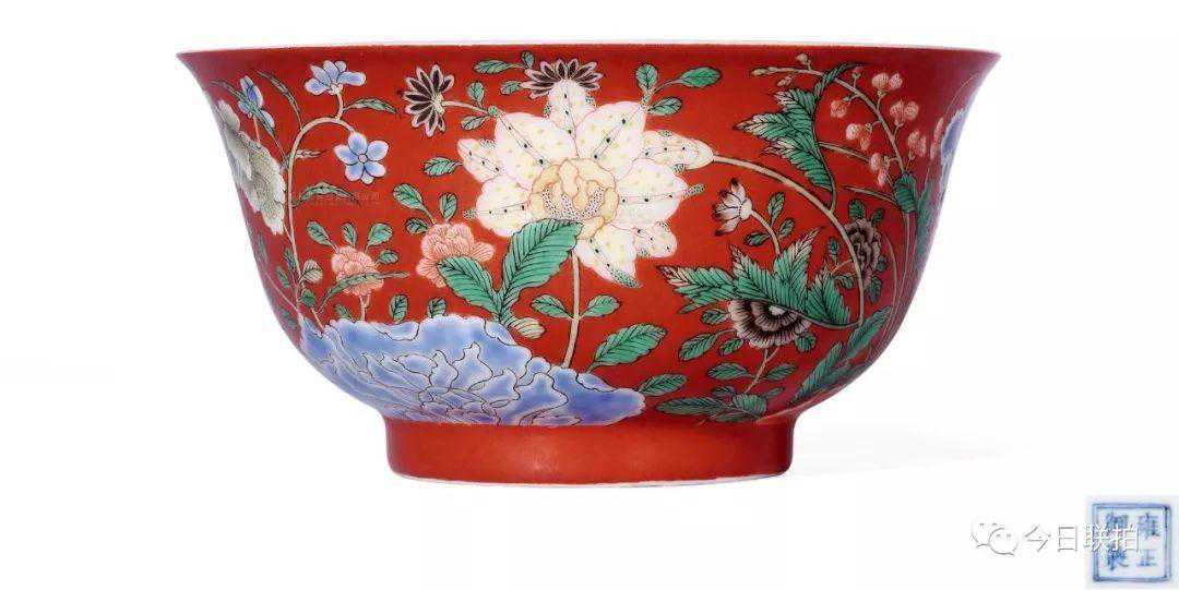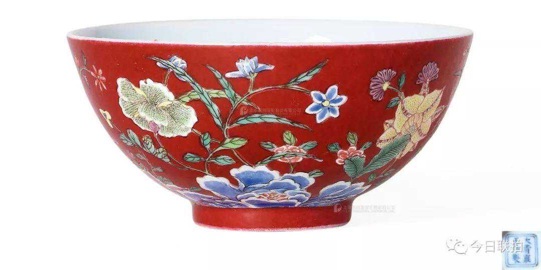 清雍正珊瑚红地洋彩九秋同庆图碗