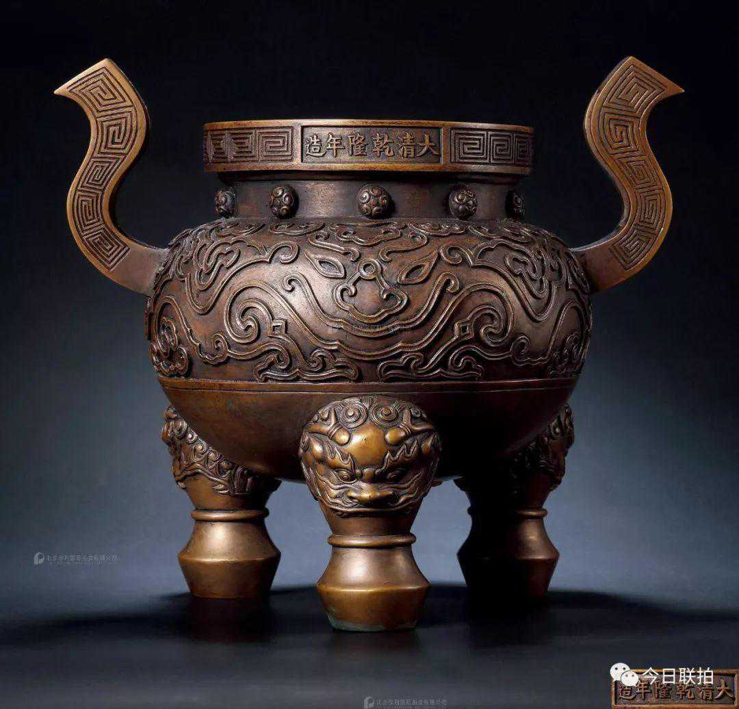 清乾隆铜兽面纹冲天耳龙纹三足炉