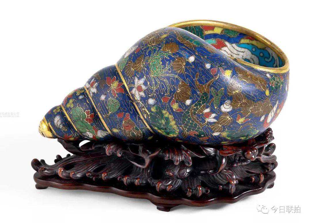 清康熙铜胎丝珐琅荷塘鱼藻纹海螺法器