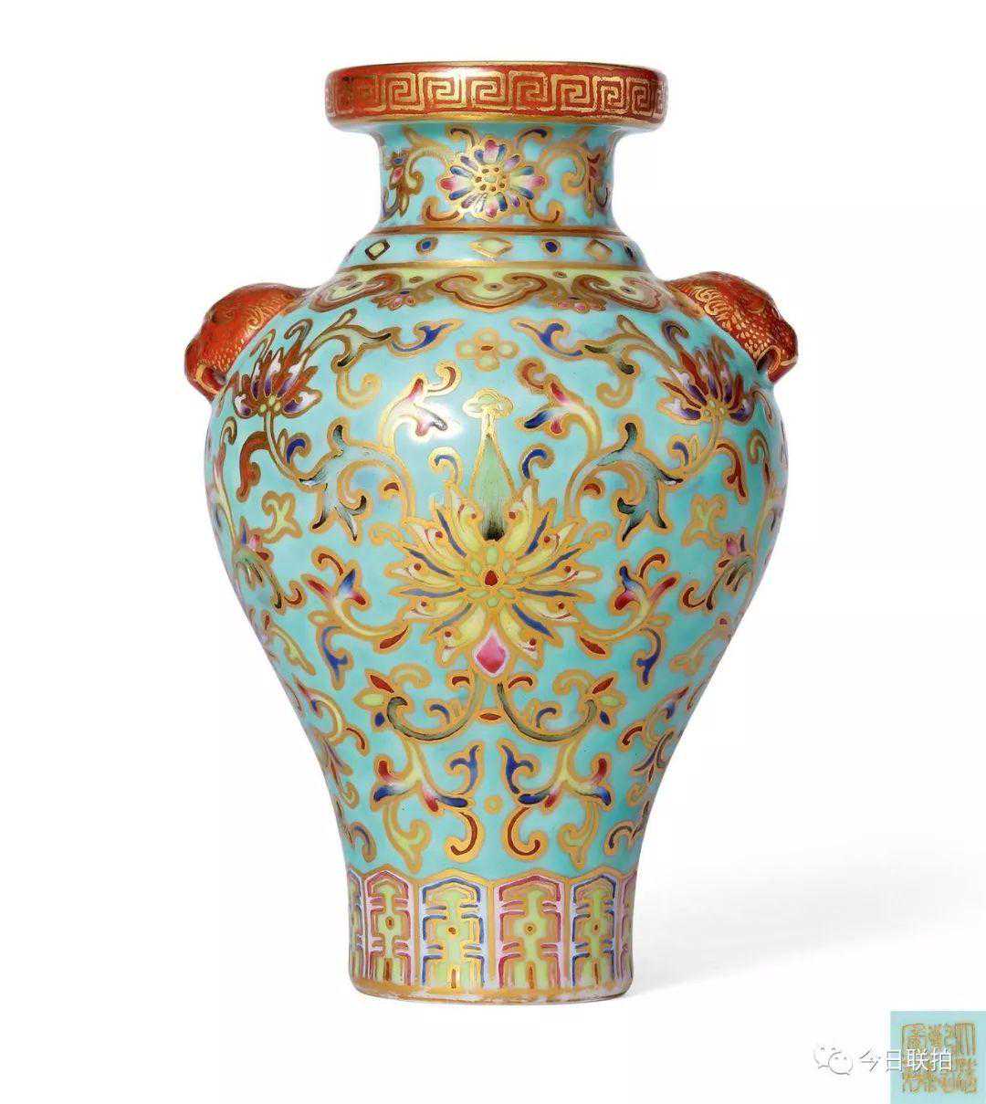 清乾隆松石绿地粉彩缠枝花卉纹兽耳瓶