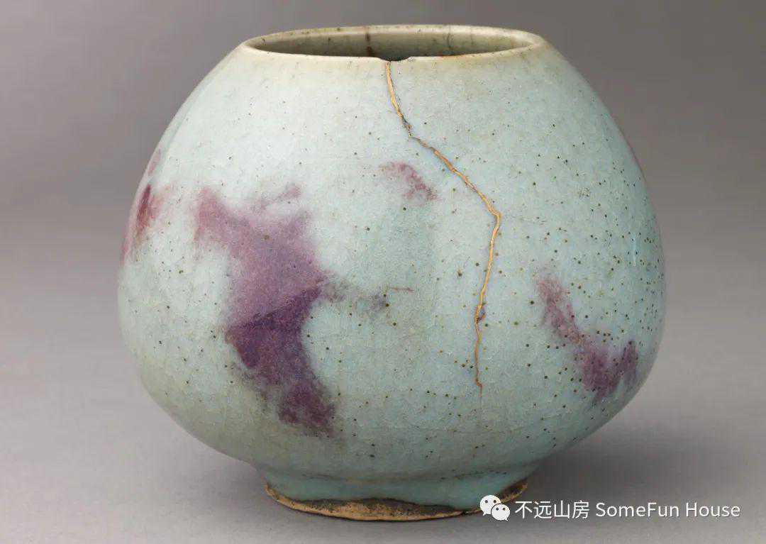 大都会艺术博物馆藏金代钧窑天青釉玫瑰红窑变鸡心罐