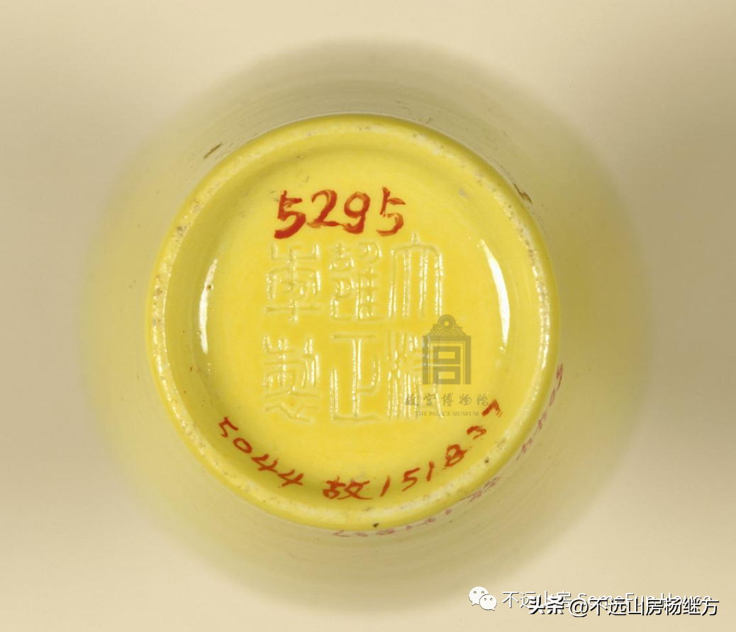 雍正黄釉,不像康熙朝那样在素坯的涩胎上施釉,而是在烧好的白瓷上施低温黄釉,所以十分洁净,蛋黄釉多见小件薄胎盘、碗器物,有少量凸雕莲瓣的黄釉盘口径可达40厘米。黄釉有里外全黄、里白釉外黄釉之分,盘、碗的底白釉内多有青花六字楷书款:“大清雍正年制”。青花六字篆书印章款的器物较少。黄釉制品的用途主要是祭祀用品和日常餐饮。据《清档》记载:“雍正元年正月十六日,怡亲王黄瓷盘六十件,黄瓷碗八十个。王谕:此盘、碗上配做铜果托果罩。遵此。一般来说日用餐用盘、碗是不必配置铜果托果罩的,只有盛装供果的盘、碗,便于祭品的摆放才需要配托罩。