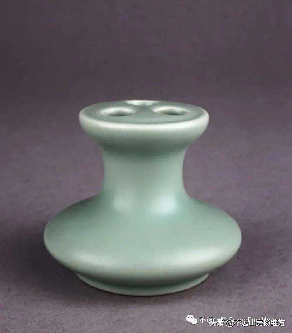 仿哥釉——旧称“铁骨哥釉”,有粉青、米色两种,造型比仿官、汝釉少,盘口瓶、双贯耳方瓶等与仿官、汝釉相同,另有新增的三孔穿带耳扁瓶、双耳四系瓶、乳钉石榴尊、双鱼耳香炉、笔山子、笔洗、水丞等文房小件器皿。釉色青中泛浅灰者居多,釉青有类似“金丝铁线”深浅交错的开片纹,多数制品圈足内暗刻六字篆书印章款,少数不带款识。