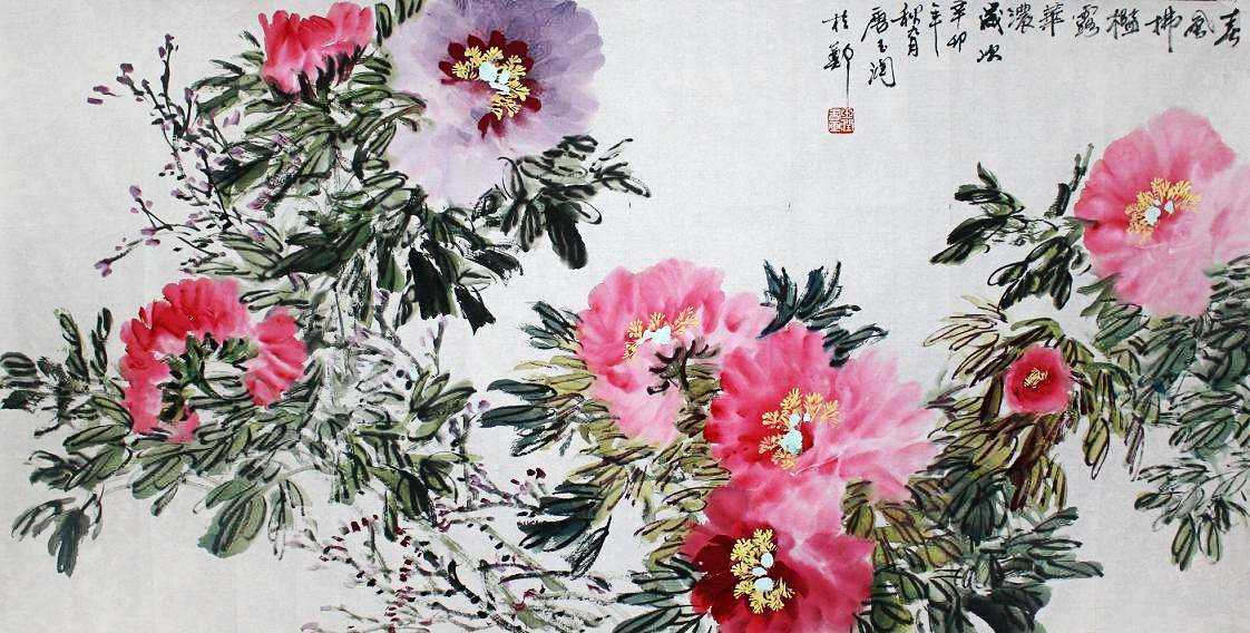 唐老师早年曾习工笔,50年代师承八大山人、任伯年、吴昌硕、陈半丁、齐白石等大家,画风为之一新。他的花鸟画以牡丹著称,素有“唐牡丹”之誉。
