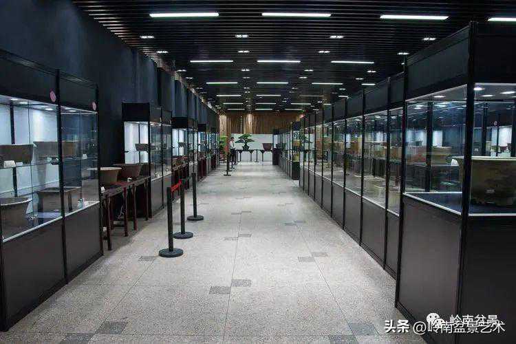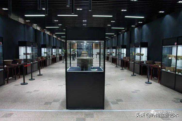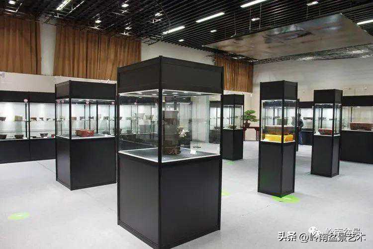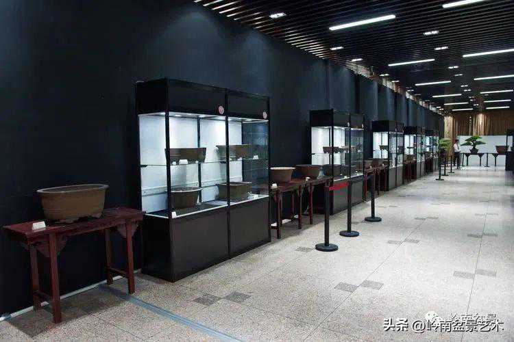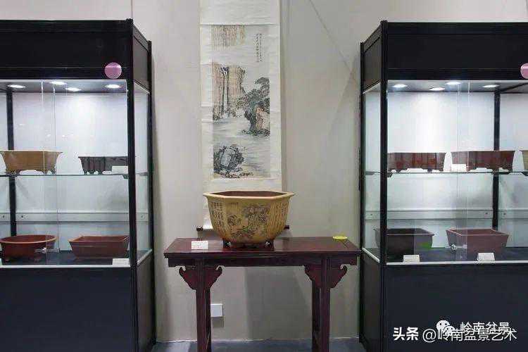 因为此次古盆展参展盆器十分名贵而且是易碎品,所以都以橱柜形式布展。不利的是因玻璃加上射灯及其它光源干扰,用了偏振镜也无法解决反光问题,照片拍摄效果不理想,好在申洪良老师近期要出版有关专题书籍图册,喜欢古盆的爱好者敬请留意。