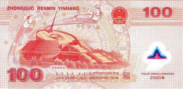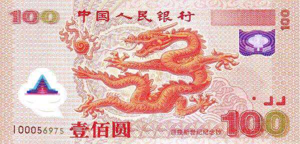 ❷2000年迎接新世纪纪念钞,面值100元,俗称龙钞,这是第一枚人民币塑料钞,发行量1000万,目前市场价1600元左右;