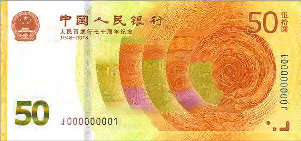 ❺2018年人民币发行70周年纪念钞,面值50元,发行量1.2亿,目前市场价70元左右。