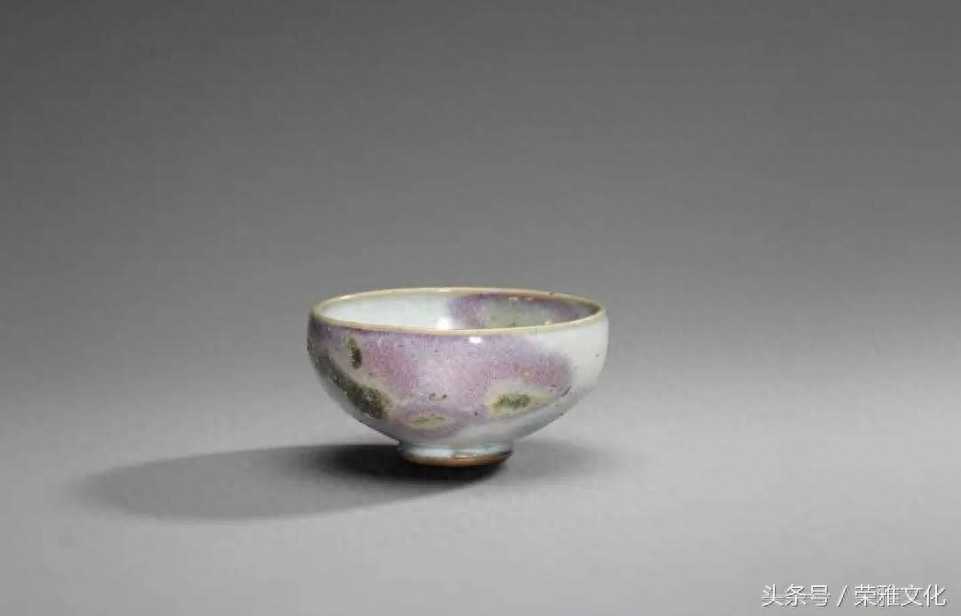 北宋-金钧窑天青釉紫斑小碗。奉文堂当然是财力眼光兼备。细细品味她的藏品,其侧重点显然是“眼光”,而非“财力”。比如本期封面那件瓷塑,乾隆官窑也许比它贵上百倍,但艺术水准可能永远无法望其项背。