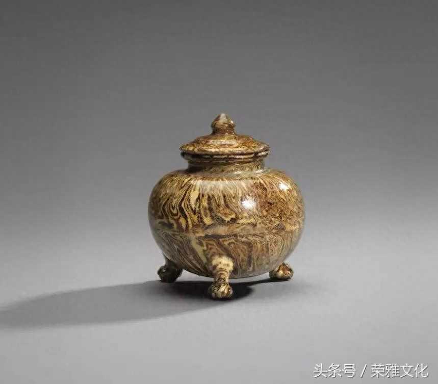 唐绞胎三兽足小盖罐。