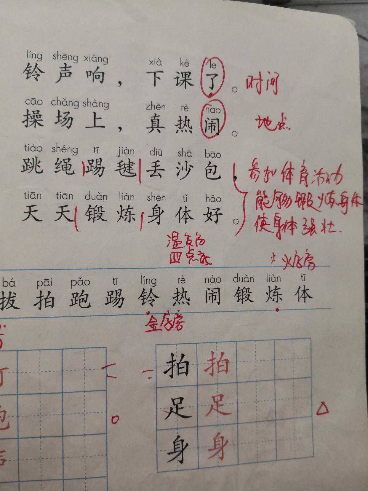 11.“体”拼音:tǐ左右结构“单人旁”加“本”注意跟“休”的区别组词:体育、体能、身体。