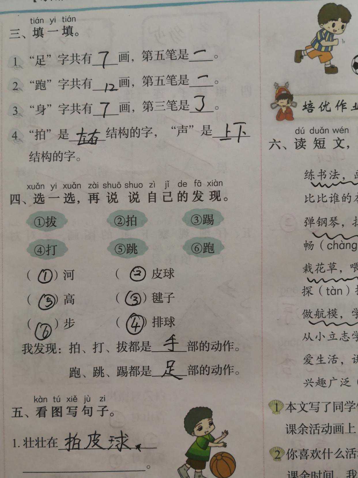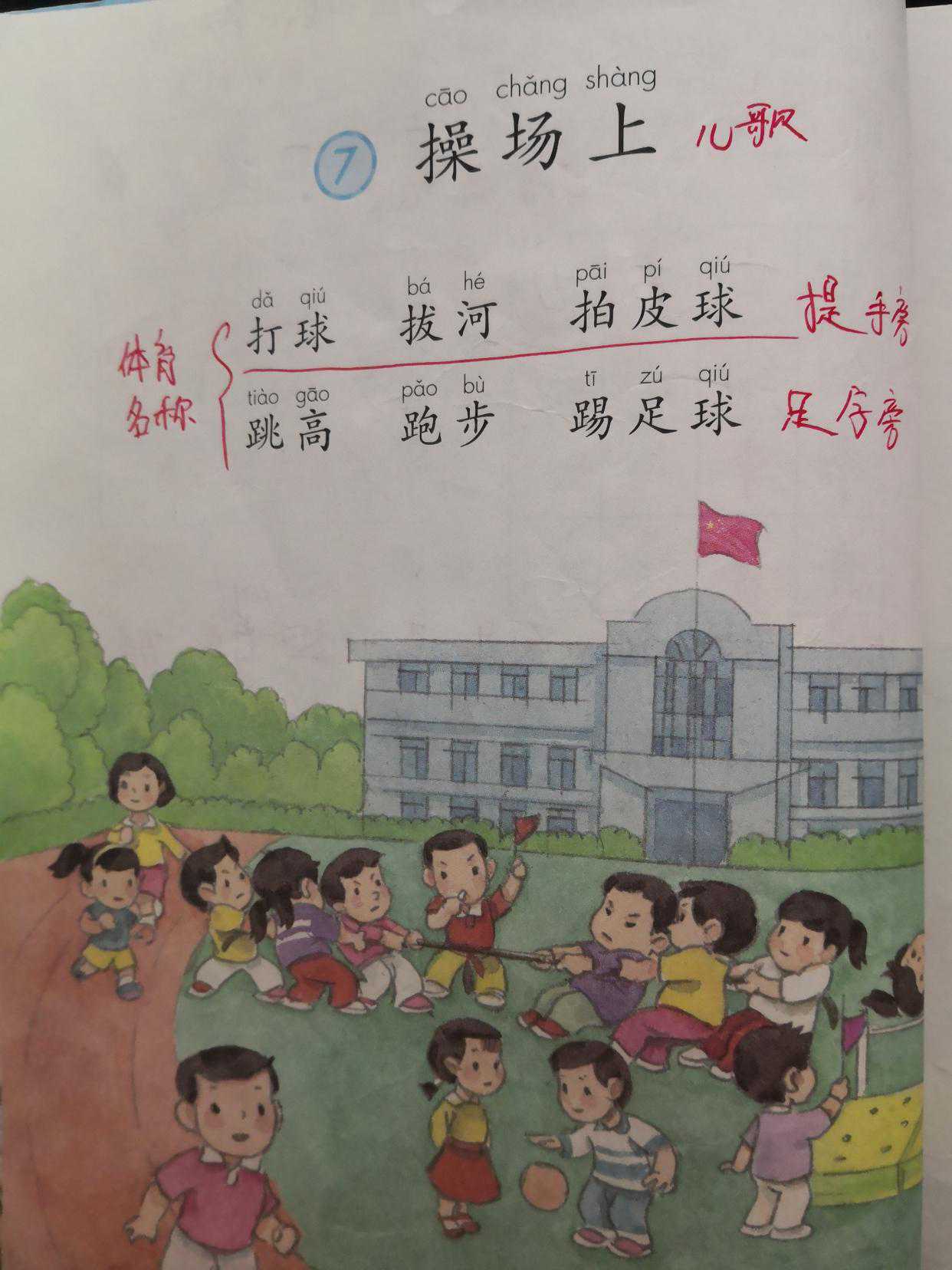 这篇是以体育锻炼活动为主题,由一幅画、6个词语和一首儿歌组成。词语都是体育活动名称,第一行的活动与手有关,词语中的动词都带提手旁;第二行的活动都跟脚有关,动词都带足字旁。儿歌描绘了下课后同学们在操场上活动的情景,告诉小朋友参加体育活动可以使我们身体更加健壮。