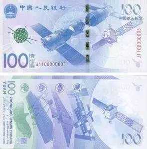 中国航天纪念钞:发行于2015年,为纪念中国伟大航空事业取得卓越成就而发行,发行量3亿张。