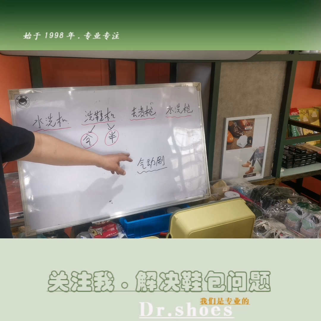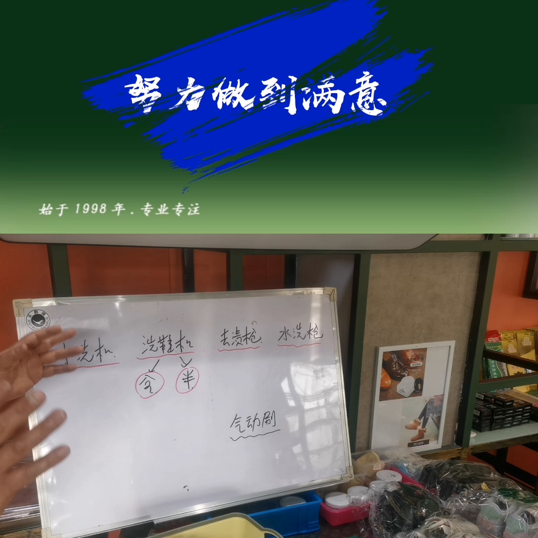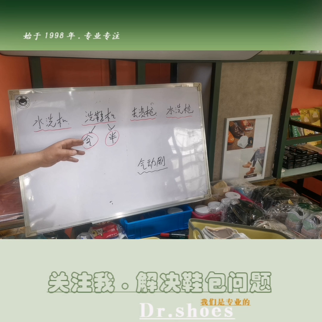 就没有什么?今天我就在这块给大家分享一下水洗机,洗鞋机分量全自动半自动,然后用到一些工具曲子枪、水洗枪、气动刷这些设备和工具。大家根据自己店的情况和你进入这个行业的长短合理选择。所有的这些东西都有弊,它都是一些工具,最主要的是自己从业者怎么去合理的使用这些工具,这是最关键的。