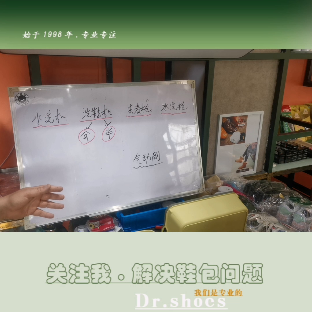 今天同样起了个大早,找了个小黑板想给大家分享一下我们店这么多少年的在洗鞋方面的一些心得,所使用的工具,所使用的一些设备。考虑到设备机器的一些厂家的品牌问题,所以就不做图片了,用文字的形式给大家做一些分类。