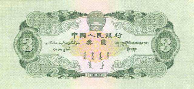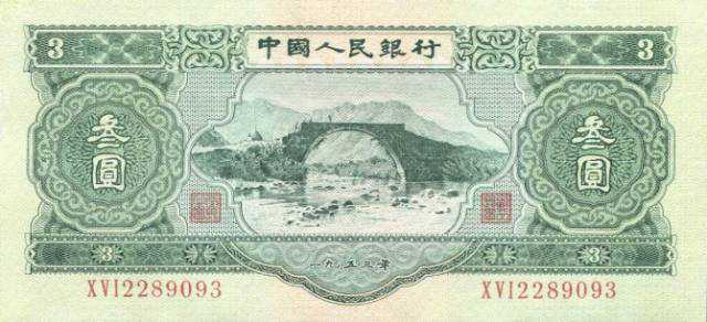 第二套人民币中有一款十分罕见的人民币——深色的三元人民币,它是我国唯一一张面额为三元的人民币纸币。纸币整体颜色为淡绿色,比现在流通的1元人民币稍微大一些,正面的两端各有繁体三元字样,下面标着"1953年",正上方为"中国人民银行"六字,中间是井冈山龙源口石桥图景,石桥周围的花边为深绿色,中间的底纹为黄色,纸币的背面图案是花纹和国徽,中间有汉、维、蒙、藏四种文字的"中国人民银行三元"字样。发行时间是1955年3月1日,由于历史原因,于1964年5月15日停止收兑和流通,并进行回收,目前存世量极少