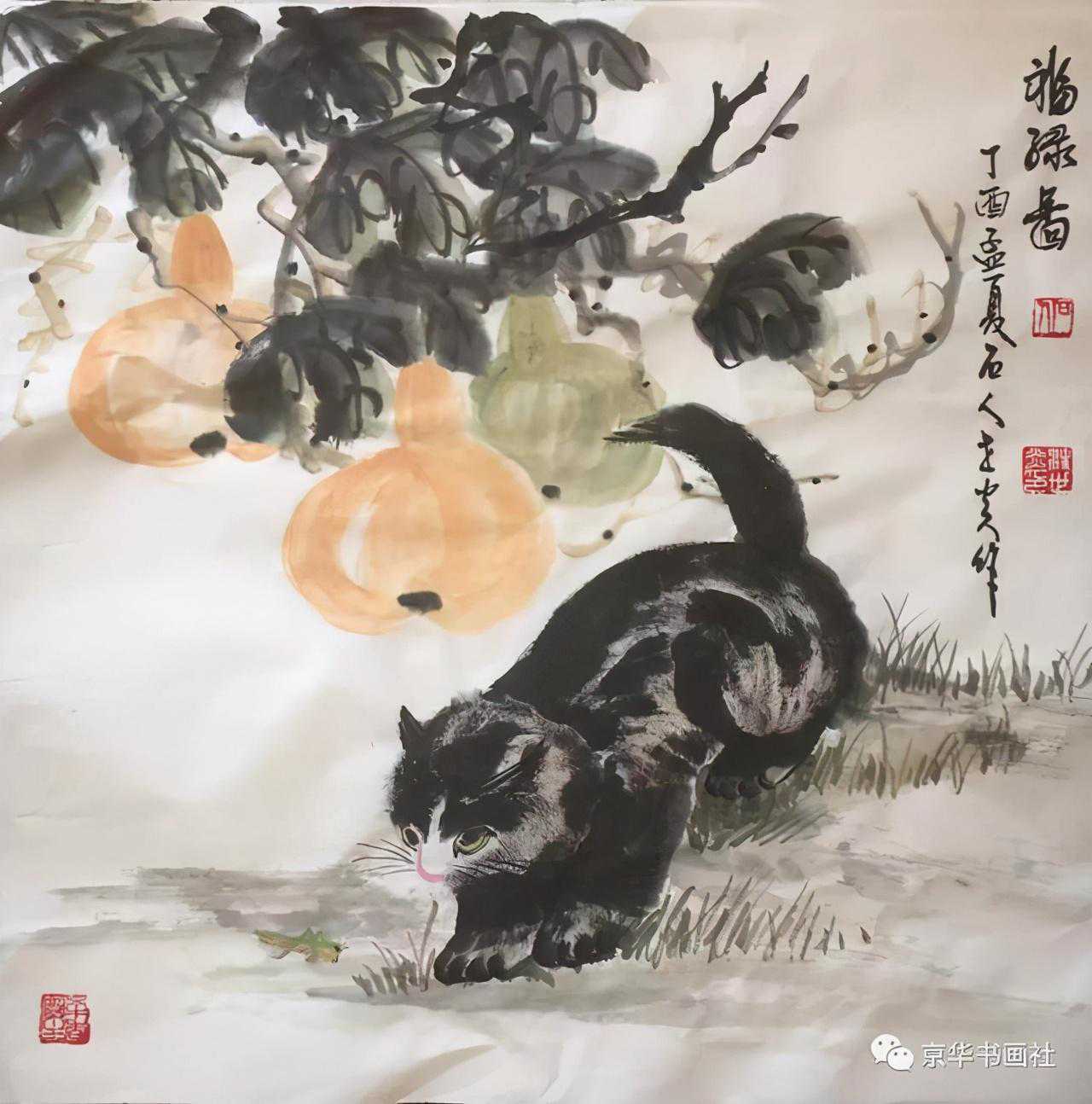 汪世炎所画葫芦,利用生宣性能,葫芦叶用笔蘸草绿后再蘸墨,笔尖色浓,笔腹色淡,墨韵浓。画葫芦略带斜势,有凌空高悬的意境。葫芦以藤黄为基色,调入适当的赭石,藤蔓用笔果断老辣,柔中带刚,用浓墨以行书的速度勾画出叶筋,点蒂似画龙点睛。