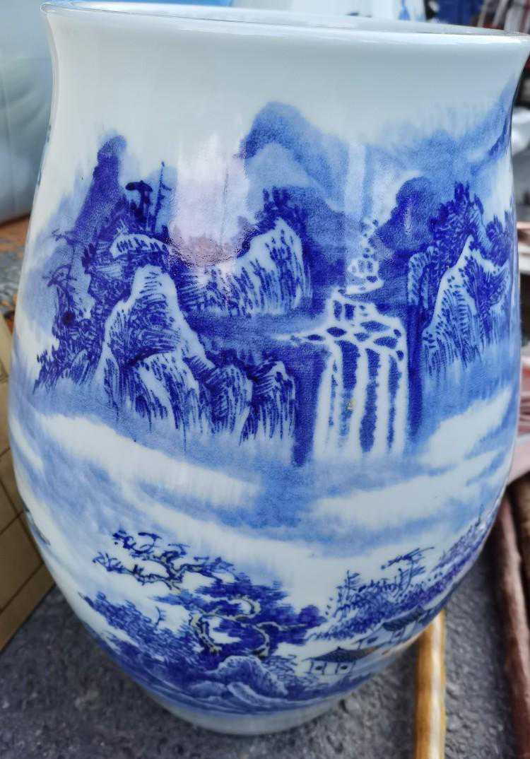 下面这只琵琶尊就是一件很好的艺术品,虽然它是现代景德镇制造的青花瓷,但是画工相当不错。为画面增色。