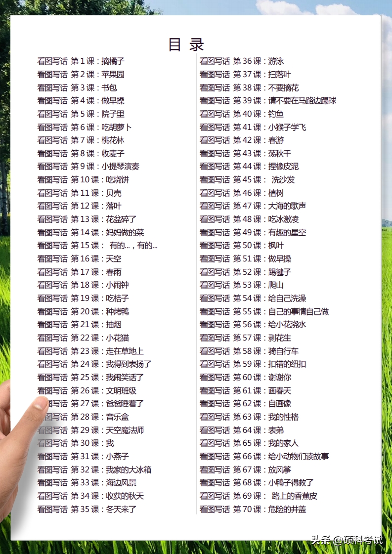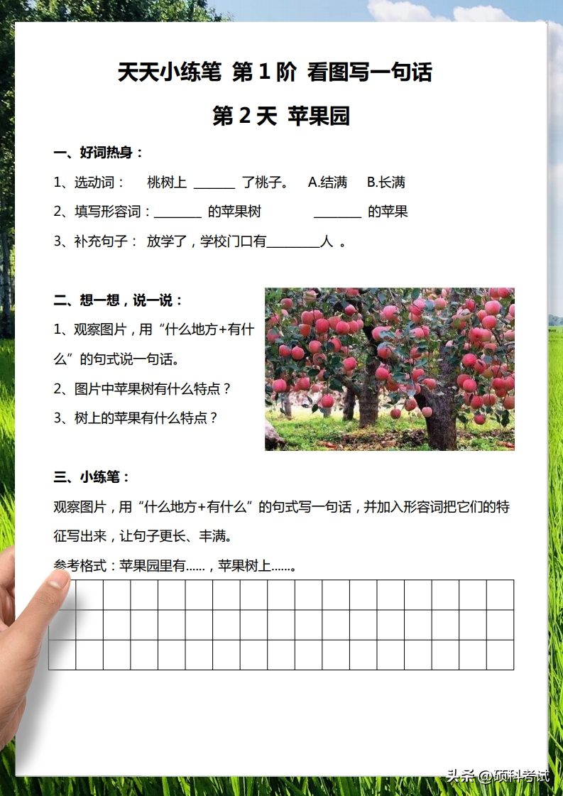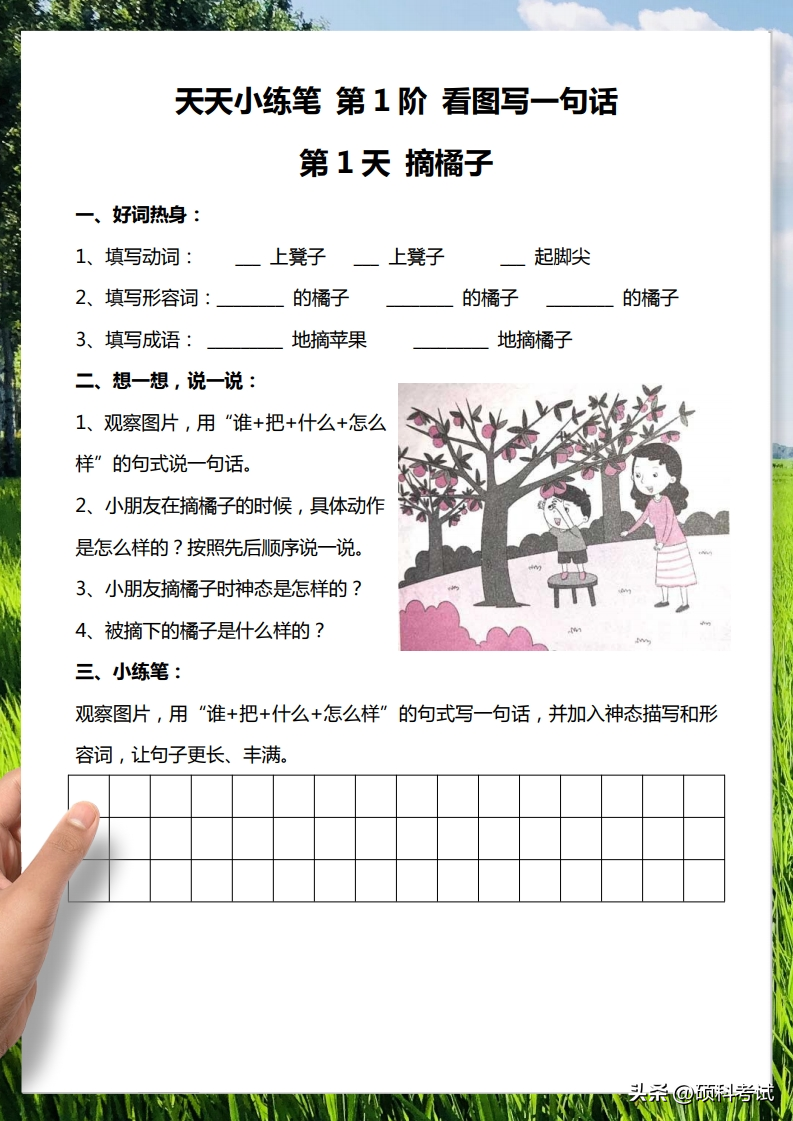 《一二年级天天小练笔》是专为孩子们设计的看图写话练习册,它以丰富多彩的图片为媒介,引导孩子们开启他们的创作之旅。从摘橘子的欢乐,到苹果园的丰收,再到小提琴演奏的悠扬,每一个主题都是孩子们生活中的一个小小缩影,每一个练习都是对他们观察力和表达能力的一次锻炼。