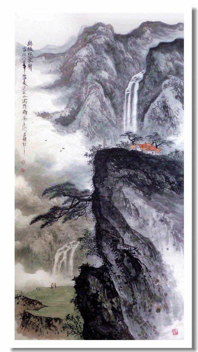 尹延水的水墨山水画作品,充满回气荡漾的感觉,一幅幅秀丽壮阔的山水画卷,笔势滂沱、豪迈大气、神全气足、变化无穷,画面雄壮浑厚,不在形色而在用笔的巧妙,心意融于画境,令人陶醉于诗情画景之中:那叠峦起伏的崇山奇峰,那刚劲沧桑盘虬在悬崖之上的松柏,那飘渺意远、令人联想翩翩的云海苍天……。不管是一树、一石、一草,随意从心而不逾矩,宛若千仞之高、博大气派,设色不仅有浅而深,也有浅而匀,天然致色、光采辉焕,刚柔相济,得其用而妙趣横生,得其神而意态为胜,不愧为高手之作。