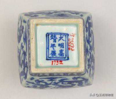 在青花瓷上,用写、刻、印等方法标明瓷器烧造年代的款识,称为纪年款。明代永乐年间,在青花瓷上开始出现纪年款,篆书字体飘逸流畅,边饰莲瓣纹。成化款铁划银钩,釉面有云蒙气。嘉靖款笔画粗重,劲中藏秀。前人曾将明代纪年款归纳为:“宣德款多,成化款肥,弘治款秀,正德款恭,嘉靖款杂”五句话。