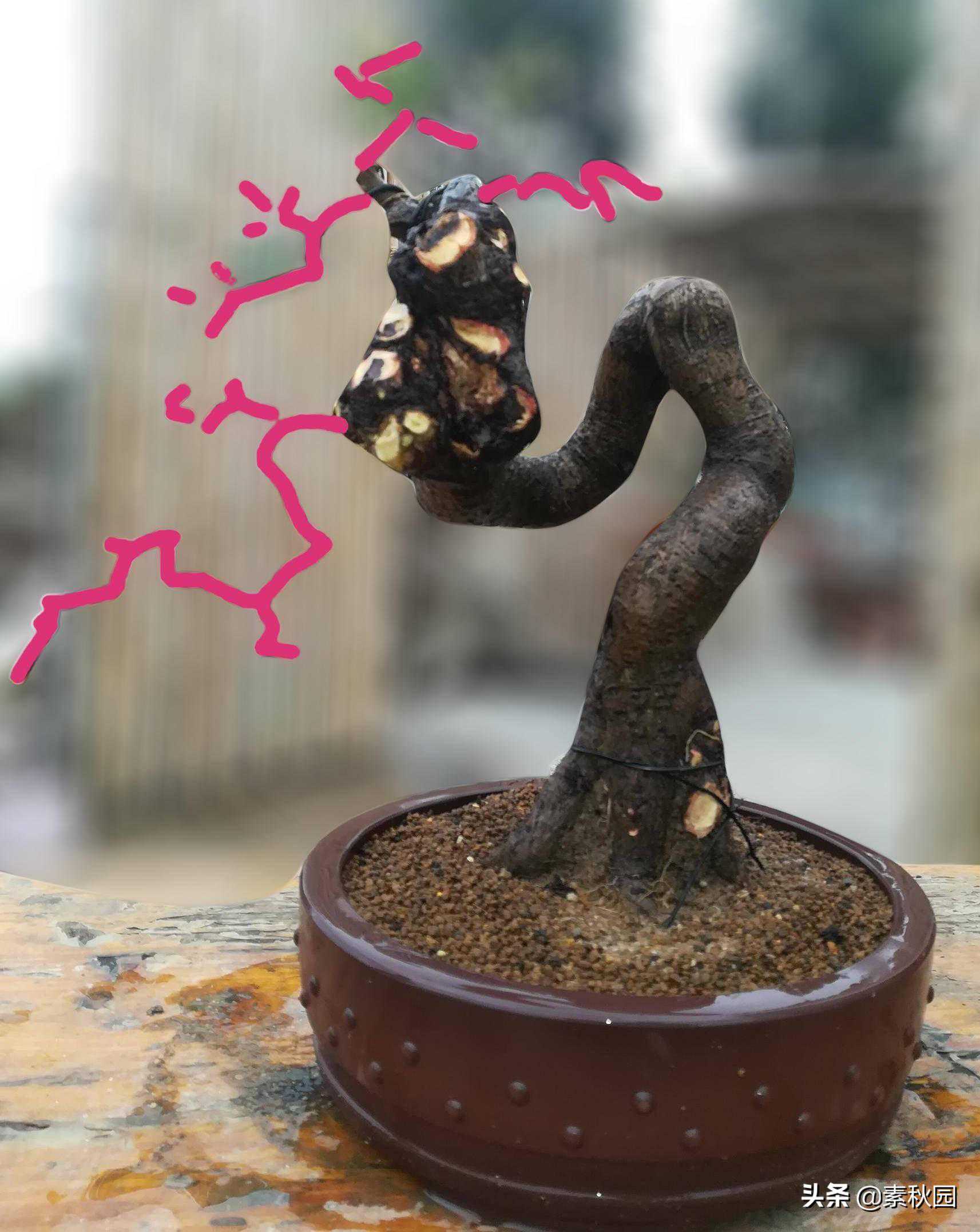 此树破杆牵拉调形后并没有达到预期的美感,思路应该是没错,但阻碍美的展现的原因还有待慢慢观察研究,一切未知有待探索与发现,这也是盆景制作之所以会让人着迷的原因。
