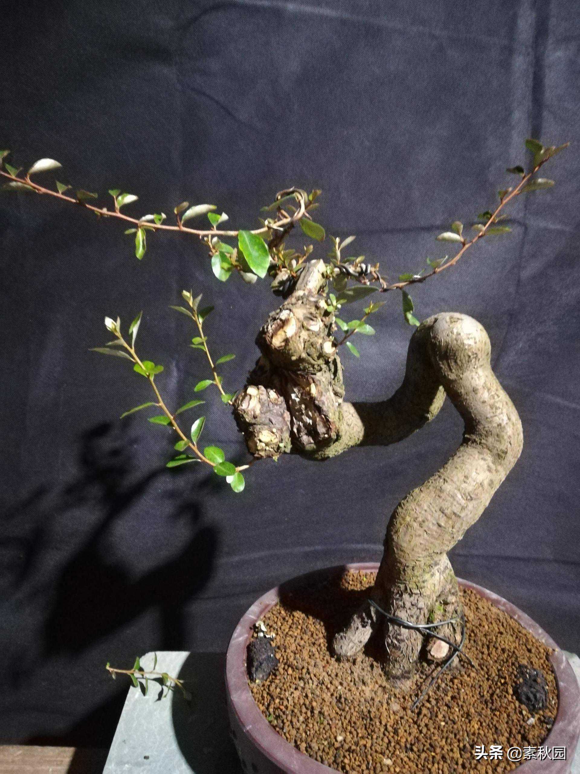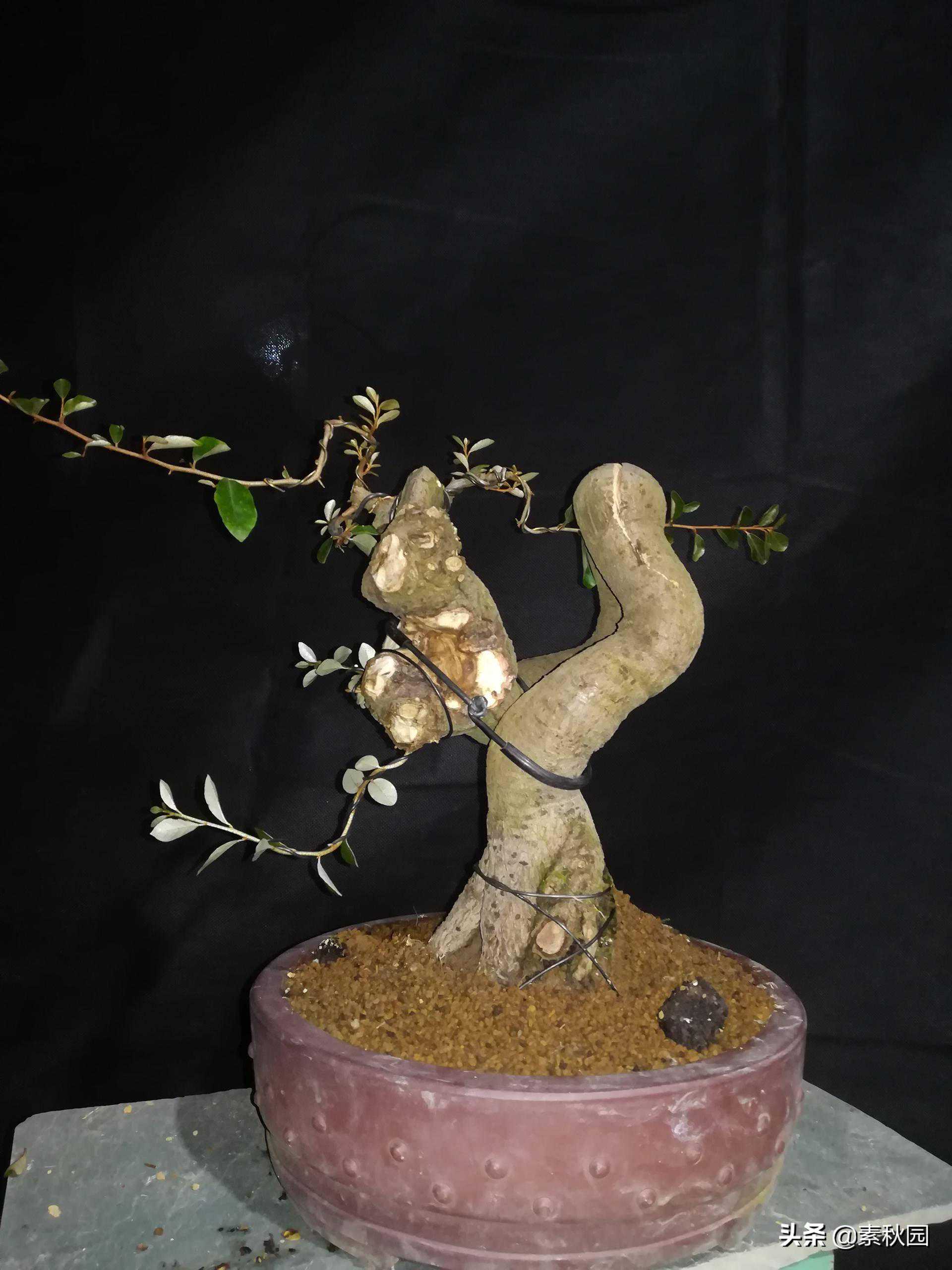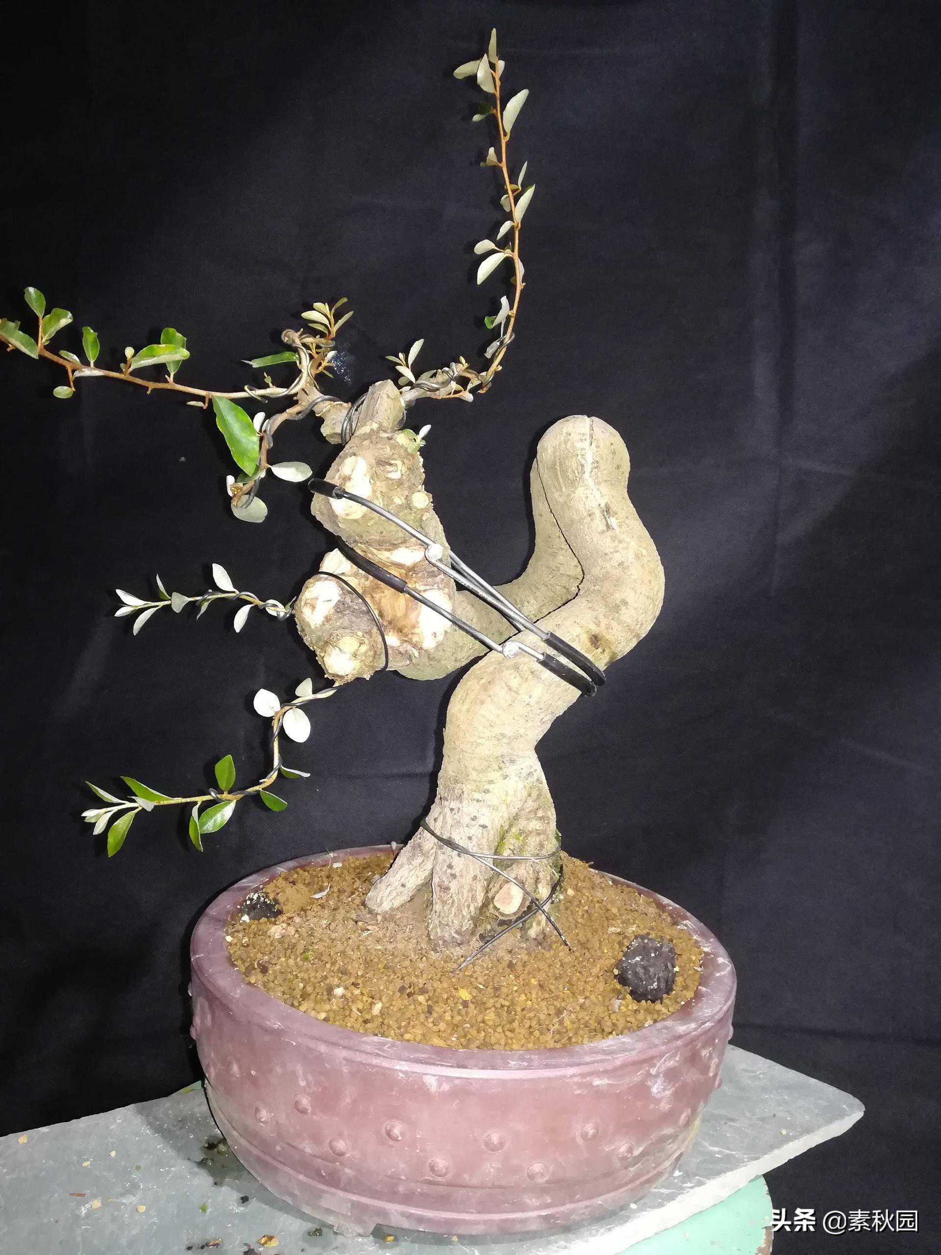 去年十一月有一朋友送了棵自己从小苗培养而成的提根胡秃子桩,线条很灵动优美,甚是喜爱!