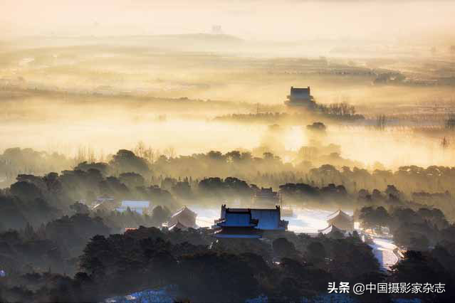 东陵晨雾。拍摄于清东陵后山,雪后的帝陵烟雾缭绕,有如仙境。机位离陵区有好几百米,而且前景有很多小树遮挡,非常杂乱,使用长焦拍摄可以局部构图,避开前景的杂物,还可以压缩景深,拉近几个建筑的距离。