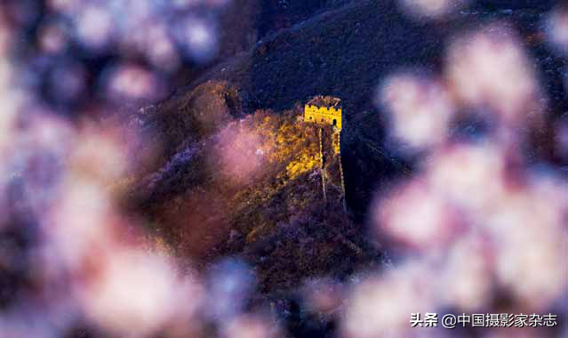 春天的长城,前景虚化的桃花很好地起到了画框的作用,主体敌楼正好被光线打亮。整个画面既交代了季节,又生动有趣。