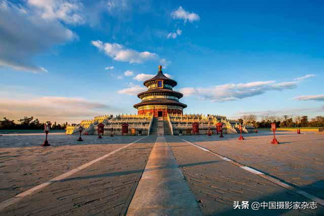天坛祈年殿,皇家祭天的地方,严格按照对称的规制所建。拍摄时找到中轴线,将主体放在画面正中,天空的云层起到了很好的点睛作用。