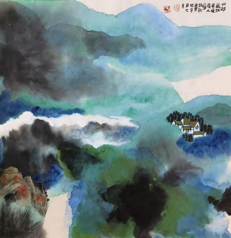 还有彩绘,苏政勋用张大千的泼彩青绿,加上西派的洋红,大黄,俨然野兽派的个性张扬,色块和空白缠绕,令人叫绝。他的“回声”、“色山”、“乡愁”、“草色入篱青”、“秋街”等作品,各擅其场,气逼纸外,画中有内在的旋律莫名让人悸动。据说老外特别喜欢他的彩绘,有许多外交官和他的商人朋友收藏,俄罗斯俄中友协的官员见到他的画以后,邀请他去俄罗斯办展,并要将俄罗斯国家科学艺术院院士颁给他,这个院士将可能开中国艺术界先河。