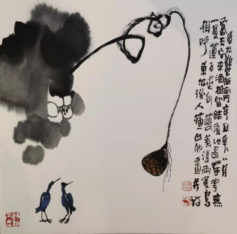 苏政勋的画有6尺、4尺、斗方、彩绘,其中以斗方居多。斗方是从日本买回的卡纸,已裱好,可直接作画,效果类似熟宣,老苏介绍比熟宣尤柔润一些。斗方内容多为山水花鸟,方寸之间,焦墨水墨杂揉,铁线润泽浑张,令人玩味。苏政勋的斗方,或简笔山水,或大块涂抹,形似张大千,又仿佛陈子庄,其实不然,满满的苏氏独特风格。有一幅枯笔山梁,其前后杂草茂林,绰约远山用润墨敷衍,颇具创意。