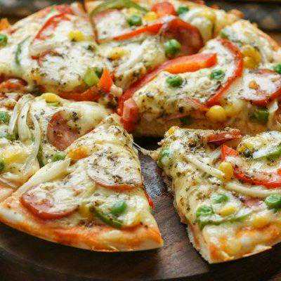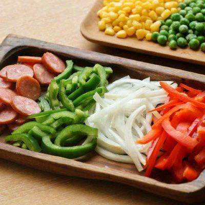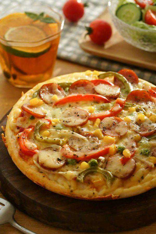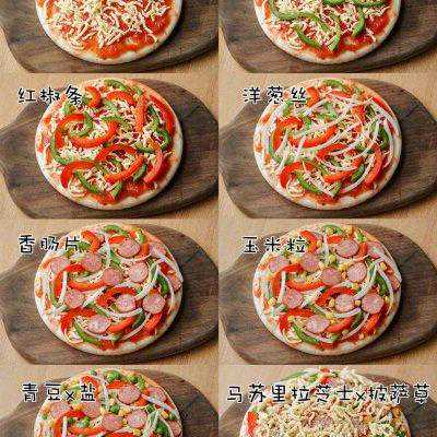 2、▪️撒一层马苏里拉芝士碎,喜欢拉丝感强的记得铺厚一点。▪️往上码你喜欢的食材,香肠玉米青豆什么的都可以,甚至有些剩菜也能往上放。表面撒盐调味,最后再撒一层马苏里拉芝士碎。