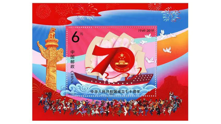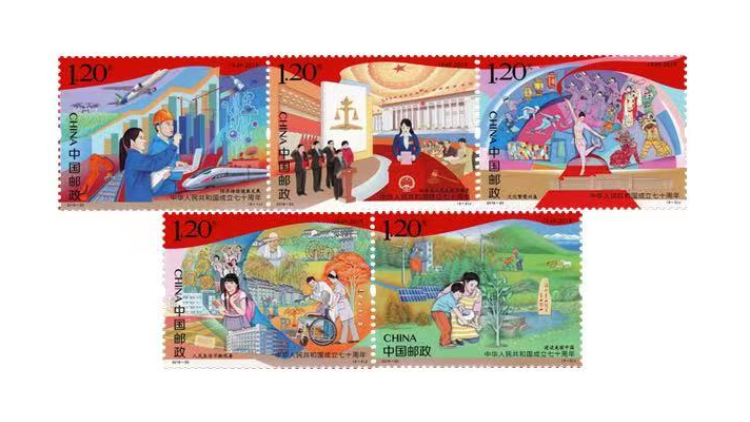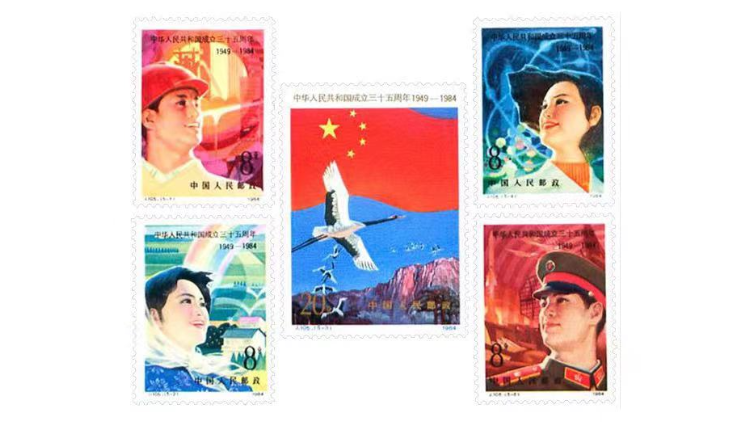 中华人民共和国成立相关邮票图稿。从上至下依次为中华人民共和国成立35周年、40周年、50周年、55周年、60周年、70周年的邮票,见证着祖国发展强盛的足迹。