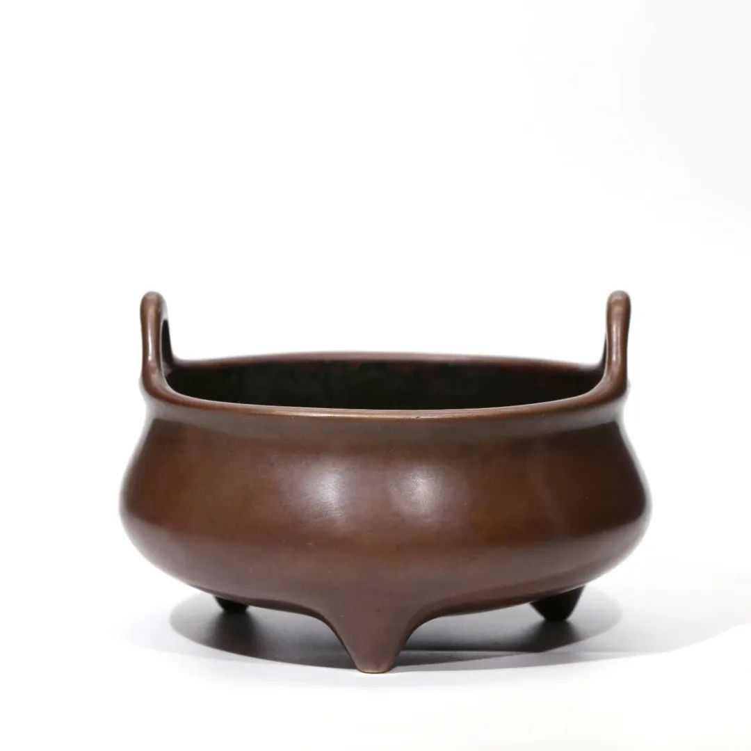 本器为清代仿大明宣德炉,宣德炉仅在宣德三年铸造过一次,共得5000只,从此即封炉不铸,故真品难觅,然则后世仿品无数,其中也出了不少精品,尤以清中期以前的仿品为佳。本器整体呈栗色,炉身宽扁而势高,侈口,短颈,鼓腹,口沿上饰冲天耳,双耳挺阔,下承三足。炉底平滑,中央开框落款“大明宣德年制”六字,笔力雄劲,朴拙隽永。炉身光素无修饰,厚重敦实,简约大气。