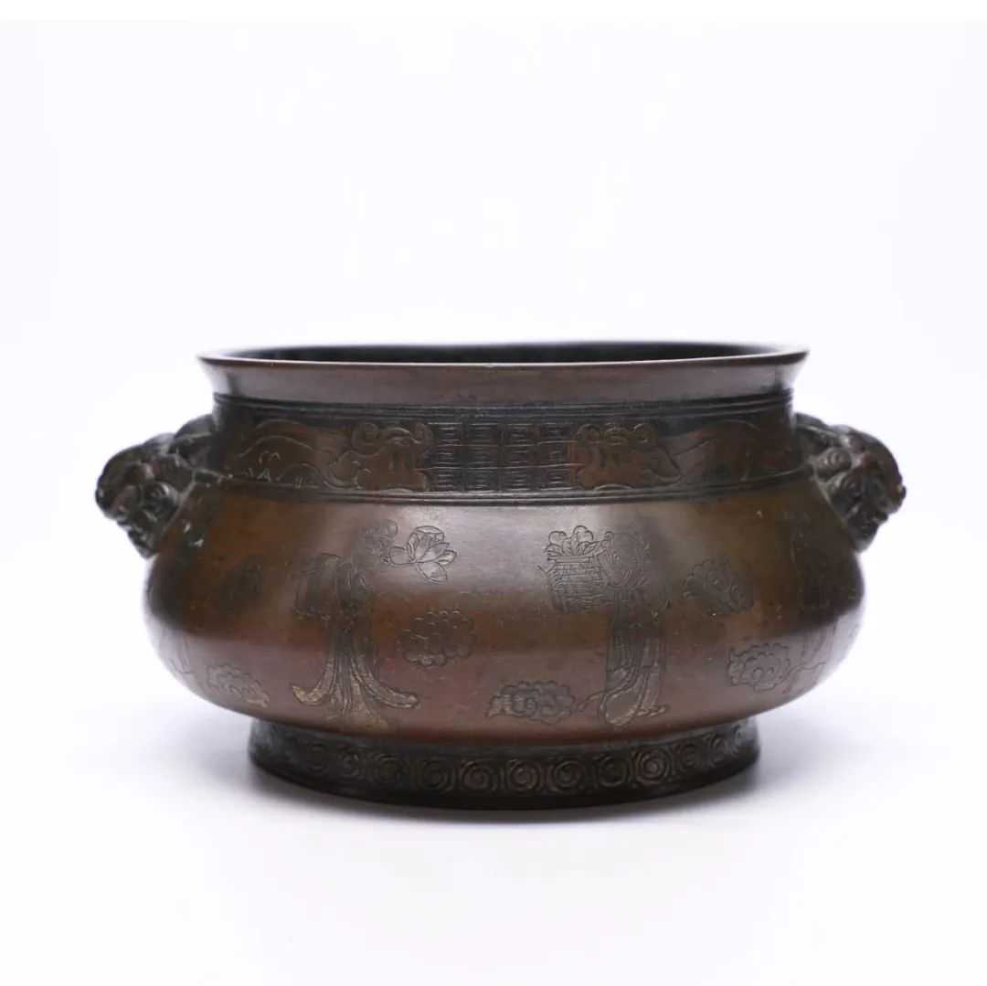 此件形制仿青铜簋,此亦为明清之际流行的款式,整体造型规整古朴,侈口,束颈鼓腹,颈部由上下分别两条弦纹分割出饰带,回纹地,并饰有云纹,器身两侧高浮雕铸成双狮耳,腹部饰八仙图,八仙各持法器,香炉底部减地阳文刻“大明宣德年制”六字,其中“德”字心上少一横,以仿照明代写法。