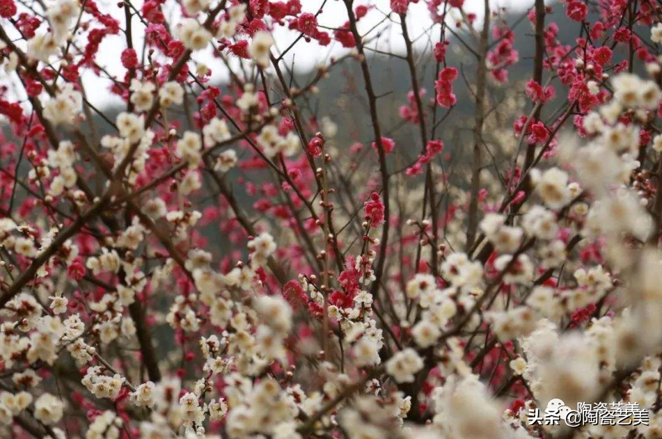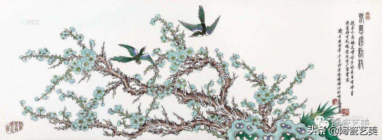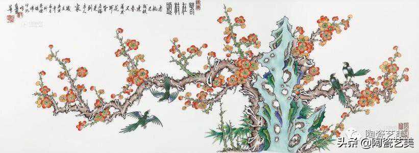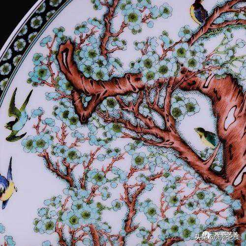 如今的蓝国华已经是江西省陶瓷工艺美术学院副教授、江西省工艺美术大师,在全国第八届陶瓷艺术与设计创作精品展评会上,其创作的古彩《梅林曲》瓷盘荣获了大赛的金奖。《梅林曲》彩盘直径65厘米,采用了景德镇特有的古彩绘饰形式,刻画“衔霜当路发,映雪拟寒开”的冬梅。