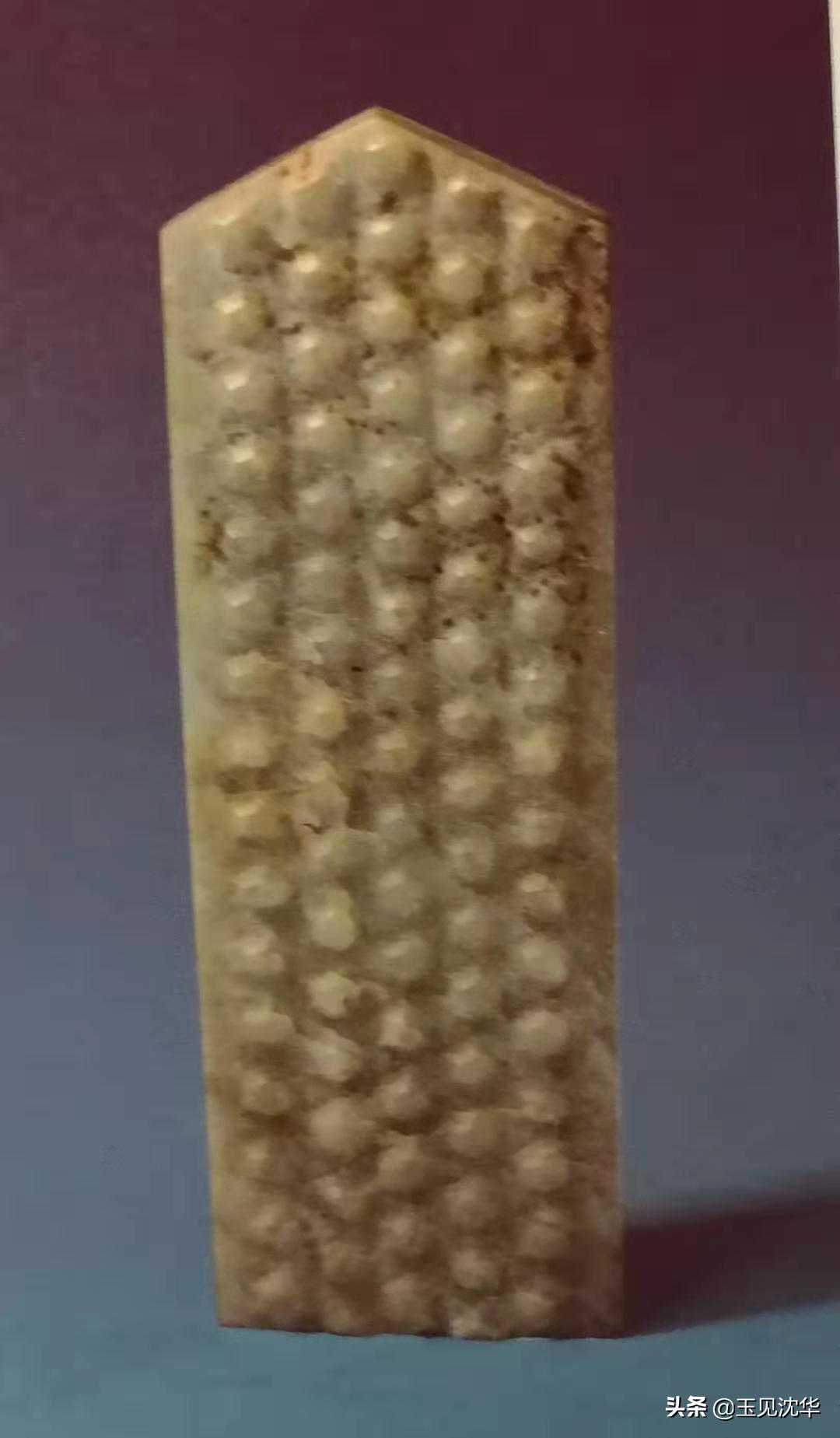 谷纹中行为十七粒,左右两行各琢十六粒零半粒,外侧两行也各十七粒,似蒲纹组织。