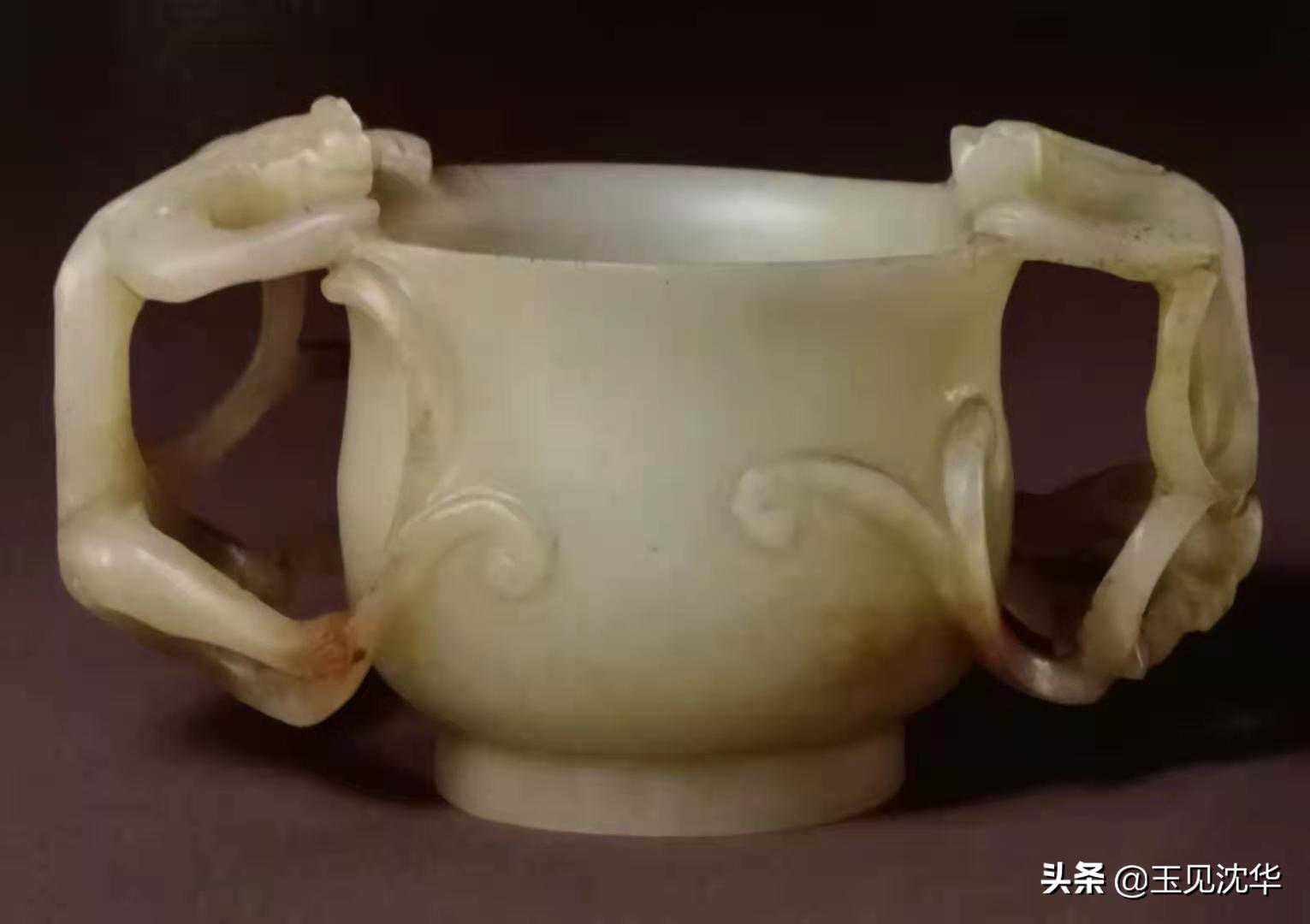青玉螭耳杯、碧玉螭耳杯均为深腹、圈足、螭耳,并寓喜意,这种玉杯此期渐增。