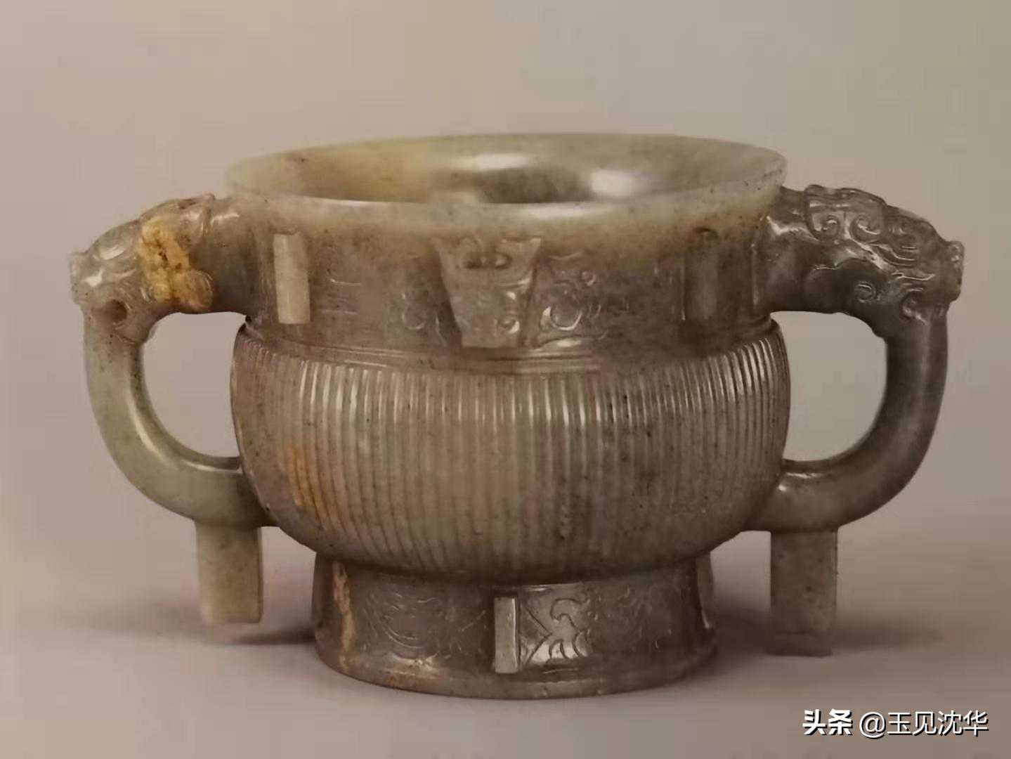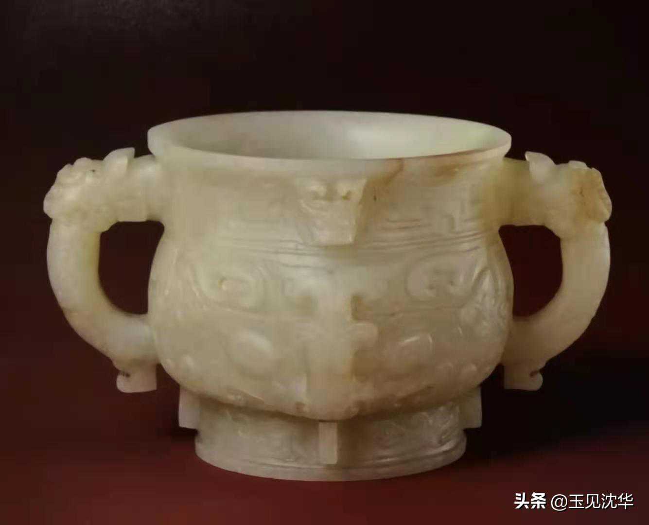白玉兽面纹兽耳炉,以青铜簋为范本,其器型、图案均与仿商“偶缶簋"相通。