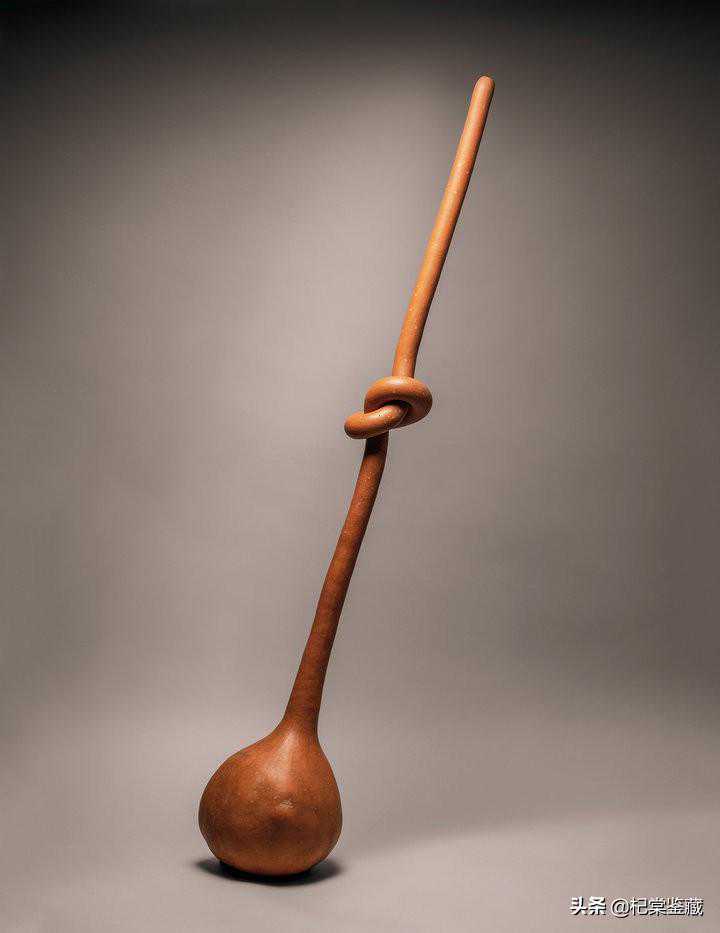出版:王世襄著,《王世襄集·说葫芦》,生活·读书·新知三联书店,2013年,第187页。葫芦长丈许,柄绾一结,圆转柔婉,色泽深黄,莹洁无暇。王世襄先生“对《说葫芦》、《中国葫芦》两书之改正与补充”一文中道明此葫芦原为美国友人JimWidess不远万里寄送。近日发现对拙作《勒扎萌芦》一节中之绾结萌芦(俗称系扣萌芦)又应有所补充。当年予编写《说萌芦》时,深信道光间张叔未(廷济)曾多方试种绾结葫芦而未能成功。为此我又多次访问京津植匏者及古董杂项摊贩,均谓所见系扣葫芦皆传世有年,未见有新种者。后于《群芳谱》查到埋巴豆一法。烦人试种,亦告失败。于是对埋巴豆法是否可信,不免产生疑问。故吾曾以为系扣之法恐已失传而深以为憾。出我意外,美国友人寄我一书,名曰《葫芦从种植到装饰》(;DonnKelver;2000;NationalCouncilofStateGardenClubs;;Missouri)书页43中一图,竟是正在系扣中之长颈葫芦幼实。文中言及由于颈部易断折,往往试系若干枚始有一二成功者,可见亦须有一定之耐心及技巧。但此法美国植者人尽知之,不足为奇。盛情可感,此后竟蒙美国友人寄我一长颈系扣者,即照片中我手持一件。予喜示天津友人万君,并烦其转告所识植匏者。系扣葫芦,选种务求长颈者,此点至关重要。数月前万君告我天津已有系扣成功者,并正在研究如何用颈较短之葫芦系扣,进一步将试验如何将两枚葫芦用系扣将其联结在一起。我已有预感,系扣葫芦正如四十年前已渐绝灭之范制葫芦将喜庆重生。不出十年,系扣葫芦在京津亦将不再是稀罕之物矣。