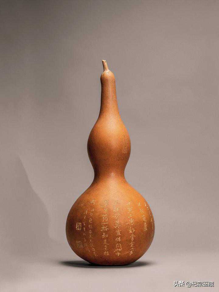 官模子八方七言绝句蝈蝈葫芦,范四瓣。诗曰“诸佛由来只此心,何须泥塑与装金!世间点烛烧香者,笑倒慈悲观世音!”官模子缠枝莲纹蝈蝈葫芦,周身范缠枝莲纹,花叶舒朗,皮色红润。