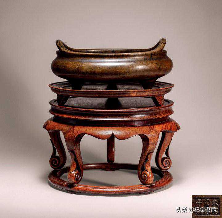 此炉圆口,短直颈,上出双桥耳,大小匀称,鼓腹微垂,底设三乳丁足,齐、平有力,整器各部比例协调,造型端庄典雅。炉身厚重,精铜炼制,发色沉稳,包浆肥厚,细腻如玉。底部“大明宣德年制”双行六字楷书款,字体工整遒劲,笔划横直,琢刻有力。久经藏家盘熟,铜炉内蕴的精光外显,熠熠生辉。桥耳炉又称“丹眼耳”,因双耳做成有弧度的桥形立于口沿而得名。汉明帝时期,命博士祭酒讲经史,数以万计的士人环向桥门而听,故明宣德皇帝以桥耳炉赐于国子祭酒,以取“环桥听经”之意。此炉与《宣德鼎彝谱》所绘桥耳炉中之标准形制相符,此炉原配黄花梨有束腰三弯腿带托泥矮香几,圆形香几设束腰,三弯腿,五外翻如意云头足,落在环形托泥上,造形优雅,线条委婉流畅,与《乾隆赏古图》中铜炉造型基本一致,凝重大气。