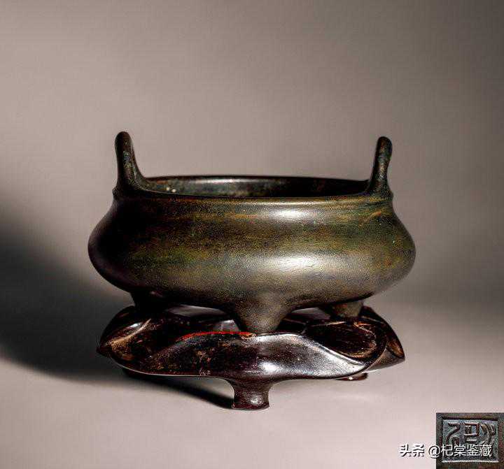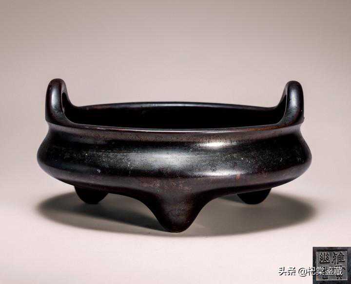 此炉唇口微外侈,束颈,冲天双耳立于沿上,浑圆腹,腹下圆收,底承三乳足。内膛可见跳刀旋纹。炉底开框錾刻“雅赏幽香”四字阳文隶书款,结体古拙,工整有度,刀法劲健,富金石气。整体造型扁圆浑厚,重心沉稳,古雅文隽,气韵不凡。“雅赏幽香”诗文字句,意境优雅俊逸,别于一般作坊款或是大明宣德年制款,以款点题,描述情境与氛围,可以想象书斋主人焚香操琴,进而雅赏其幽香,文气清雅,品味非凡。冲耳又称朝天耳,炉形典雅美观,器型源于宋代官窑,明宣宗曾以此式炉置于干清宫等议政殿堂,相伴朝议,于是有“敬天法祖”之意。冲耳炉不仅在宫廷中颇受青睐,亦被贵族文士争相铸造,此炉造型素简,底镌私款,持之坠手,叩之音清脆亮,颤越悠扬,气息娴静,是为文人雅器,当是文人参与定制之作。