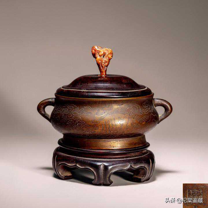 炉作蚰龙耳簋式,口沿平侈,收颈,腹部圆鼓略扁,圈足微外撇。双耳出颈曲折下收于腹部,转角圆润,浑厚有力,耳洞几近浑圆。炉身线条流畅柔美,错银饰云龙纹,分量沉重坠手,叩之金声玉振。器造型凝重典雅,铜质密实细腻,其色熠熠,蕴光其里。圈足内错银云纹环绕开框錾刻“大明宣德年制”六字楷书款,又错银“石叟”二字款识,工丽整饬,深得金石韵味。此炉附原配盖及底座,盖顶上置玉灵芝纹扭顶,衬托炉体呈现沉厚庄重的同时,又不失清秀雅致之气。石叟,明代晚期的著名铸铜僧人,其制铜独善银丝镶嵌,在制作好的铜器上錾刻或浇铸前预留出纹饰浅槽,将银丝、银片镶嵌其中,经过打磨后形成铜中嵌银的特殊装饰效果,与春秋战国时期经典的错金银工艺相似。石叟铸铜,往往将铜料与其他金属合金铸造,独创出色泽乌黑、庄重典雅的艺术效果与铸铜工艺,其作品多铸造文房用具、佛像,作品上常刻“石叟”二字款。